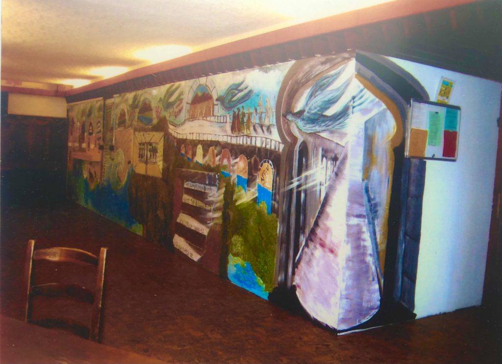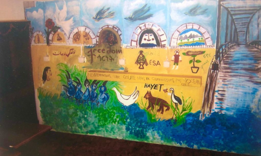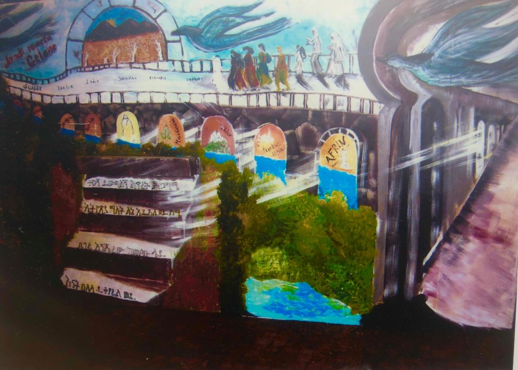 Une paroi de 12 m. de pavatex bordait la grande salle de l’Auberge du Chalet-à-Gobet où le GAMEP assurait l’accueil. En voyant des migrants dessiner dessus, l’idée a jailli d’orner cette cloison. Avec l’accord de la Commune et de l’EVAM qui a fourni le matériel, des migrants, chapeautés par une artiste et des bénévoles, ont réalisé cette œuvre. Elle représente le cheminement qui a conduit ces personnes, chassées de leur pays par la faim, la détresse, la guerre. Nous ne pouvons imaginer le calvaire et les traumatismes de la traversée de pays, de déserts, de montagnes et de mers, avec des passeurs intéressés par le profit. Le thème de l’oiseau migrateur, parcourant d’énormes distances pour trouver mieux sous nos latitudes, fut le guide d’une œuvre vécue.